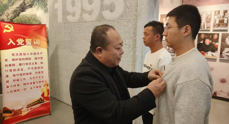 活动现场,支部书记担任领誓人,带领全体党员和预备党员逐字逐句重温入党誓词。党员们整齐列队面向党旗,右拳高擎、齐声宣誓:“我志愿加入中国共产党,拥护党的纲领......随时准备为党和人民牺牲一切,永不叛党。”庄严的誓词在纪念馆内回荡,既是对入党初心的回望,也彰显着对党的忠诚承诺。宣誓结束后,支部书记为两名预备党员佩戴党徽,并叮嘱他们要以老党员为榜样,牢记对党的承诺,不辜负党和人民的期望。两名预备党员也现场表达了加入党组织的坚定决心,表示将严格遵守党的章程,为党和人民的事业不懈奋斗。