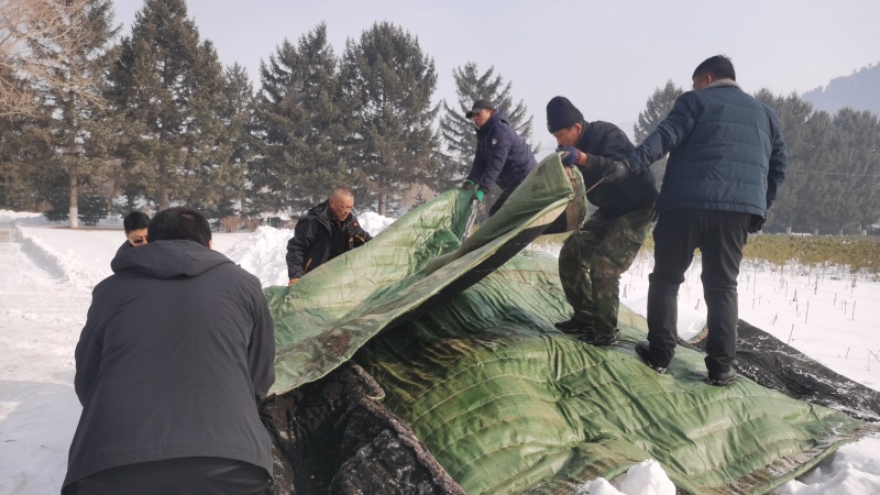 作业现场,工作人员先在窖藏坑表面均匀覆盖一层厚实积雪,利用自然积雪形成天然保温层,形成第一层防冻保护层,起到保湿、稳温、防冻作用;随后,在积雪上方加盖一层厚实保温棉被,全面压实封严,形成“积雪+棉被”双层防护体系,进一步提升保温防冻效果,为红松种子安全越冬提供可靠保障。